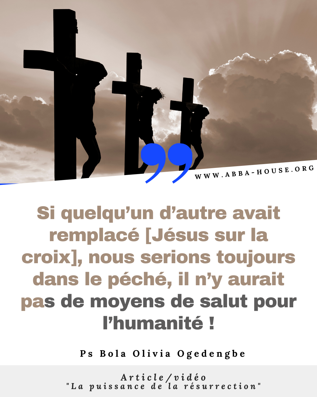 “Jésus n’a pas été crucifié parce que les hommes voulaient Le crucifier. Jésus a été crucifié parce que le Père l’a envoyé pour payer pour nos péchés. Et si quelqu’un d’autre l’avait remplacé, nous serions toujours dans le péché, il n’y aurait pas de moyens de salut pour l’humanité.