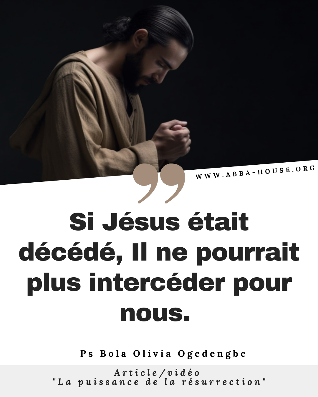 Si Jésus était décédé, Il ne pourrait plus intercéder pour nous. C’est la raison pour laquelle : on ne prie pas à des chrétiens qui sont morts, on ne prie pas à des « saints » qui sont morts. Ils sont morts, ils ne peuvent pas intercéder pour nous, il n’y a que Jésus qui peut intercéder pour nous. La Parole dit qu’Il est toujours vivant pour intercéder pour nous. Donc, aucun être mortel ne peut intercéder pour nous, qui n’est plus sur terre je veux dire.